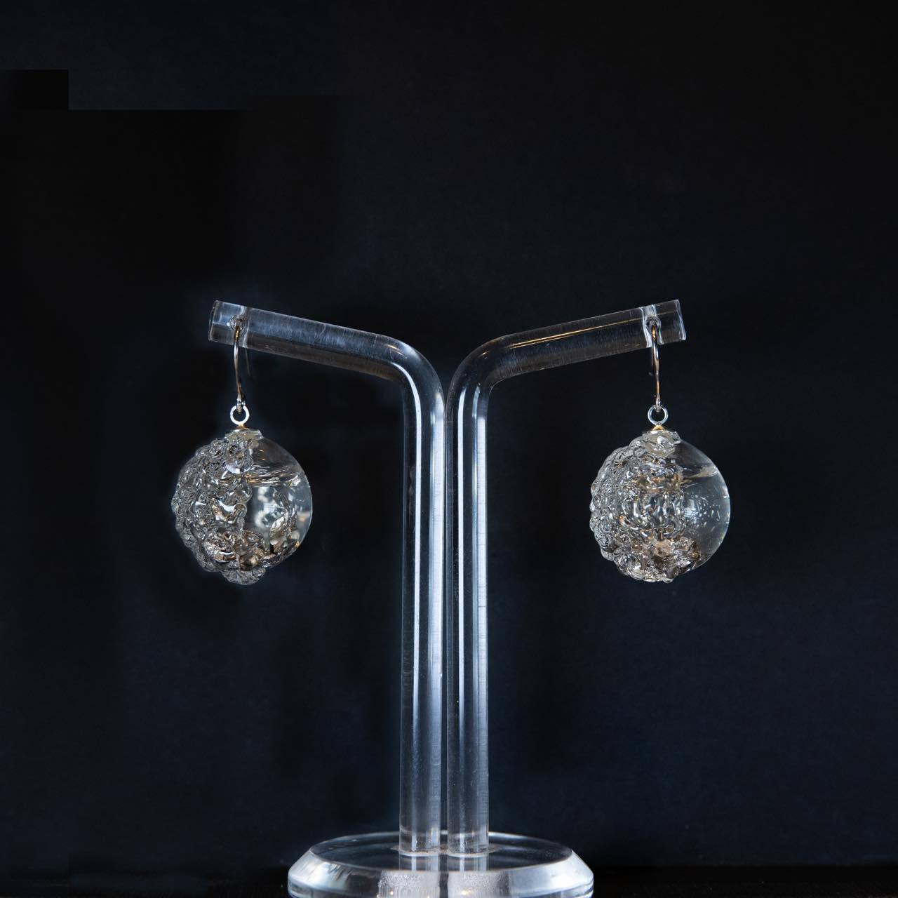 新酒が出来上がった際に酒蔵玄関に掲げられる酒林 (サカバヤシ) のデザインを透明感とテクスチャー感両方を半分ずつ引き出しながら仕上げたデザインのガラスクリエーションに、135年の老舗の群馬の酒蔵が創り出すスパークリング酒と掛け合わせた、気品溢れ、大胆かつフェミニンなデザインのピアス/イヤリング。